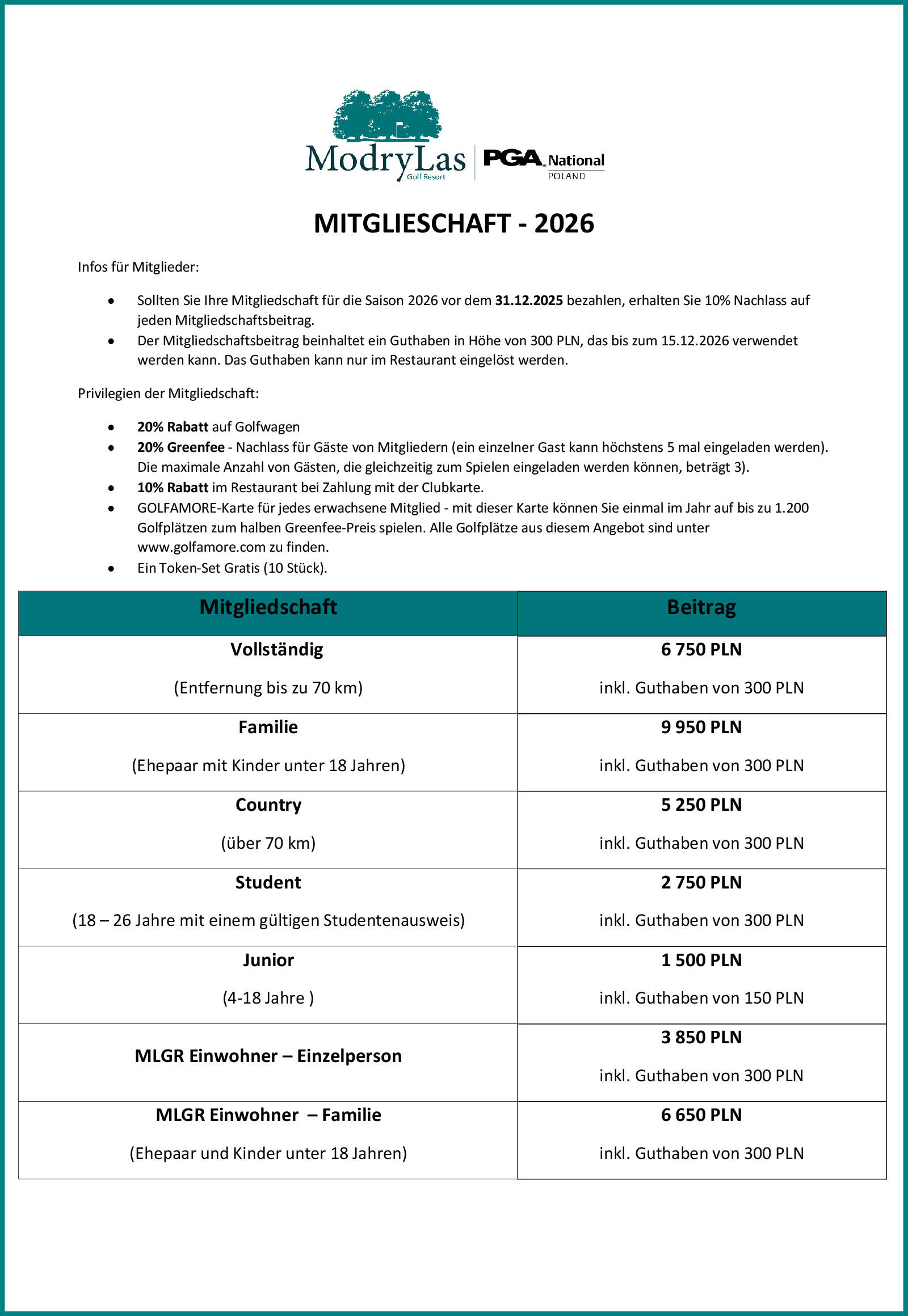 Modry Las Golf Resort | PGA National Poland heißt neue Mitglieder willkommen und es gibt eine Vielzahl von Mitgliedskategorien, aus denen Sie wählen können. Wenn Sie daran interessiert sind, Mitglied auf Polens Top-Golfplatz zu werden, laden Sie bitte das untenstehende Mitgliedsformular herunter, füllen Sie es aus und senden Sie es per E-Mail an golf@modrylas.pl